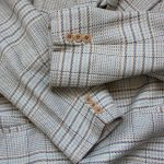 White background with a mod floral pattern done in orange, black, and shades of blue. Colorful stripes inside the collar and cuffs add a contemporary edge, and allow this shirt to be worn in a dressy way (with a tie), or in a more casual style (with cuffs turned up to show the stripes). Double button notched barrel (3″) cuffs. Nice extra-thick buttons. 100% cotton. Made in China.